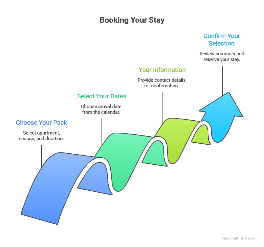 First select your apartment and the season, then the number of nights you want: 2, 3, or 7 nights.
